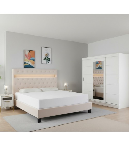 Quick view Adauga la favorite Add to Compare Set Dormitor Porto, pat tapitat Crem cu Led 160x200cm, dulap Alb 250cm lungime si saltea 160x200cm inclusa 4.300,00 lei Pat cu LED: 160X200 cm Dulap: 250X208X60cm Patul este echipat cu un sistem de iluminare LED disponibil în mai multe culorile, controlat... Adauga in cos