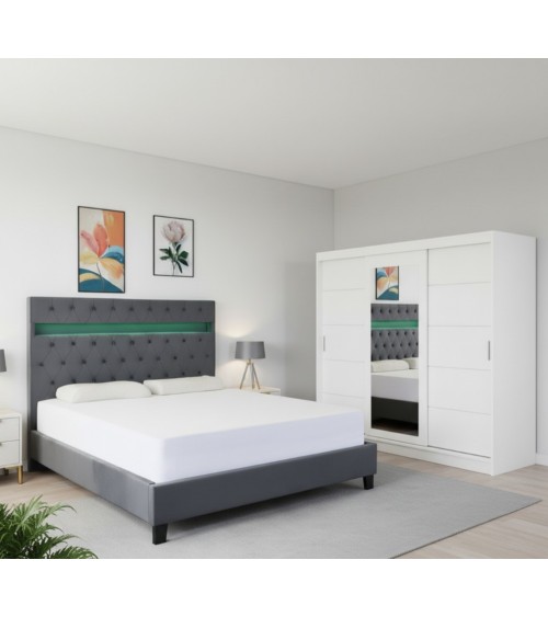 Quick view Adauga la favorite Add to Compare Set Dormitor Porto, pat tapitat Gri cu Led 160x200cm, dulap Alb 250cm lungime si saltea 160x200cm inclusa 4.300,00 lei Pat cu LED: 160X200 cm Dulap: 250X208X60cm Patul este echipat cu un sistem de iluminare LED disponibil în mai multe culorile, controlat... Adauga in cos
