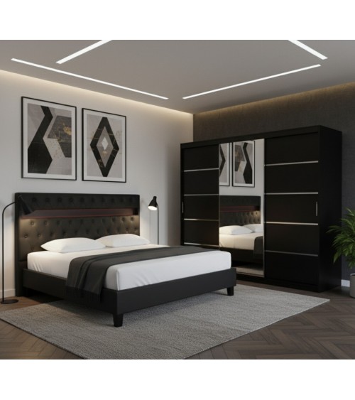 Quick view Adauga la favorite Add to Compare Set Dormitor Porto, pat tapitat Negru cu Led 160x200cm, dulap Negru 250cm lungime si saltea 160x200cm inclusa 4.300,00 lei Pat cu LED: 160X200 cm Dulap: 250X208X60cm Patul este echipat cu un sistem de iluminare LED disponibil în mai multe culorile, controlat... Adauga in cos
