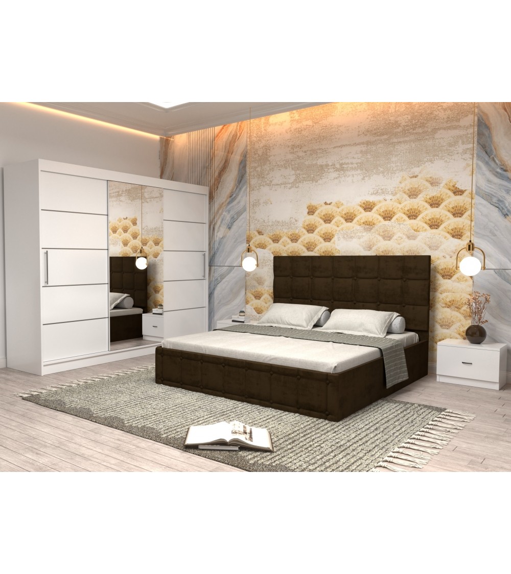 Set Dormitor King Maro/Alb, 4 Piese, Pat Complet Tapitat Maro 160 X 200, 2Noptiere, Dulap Cu Oglinda 250cm lungime
