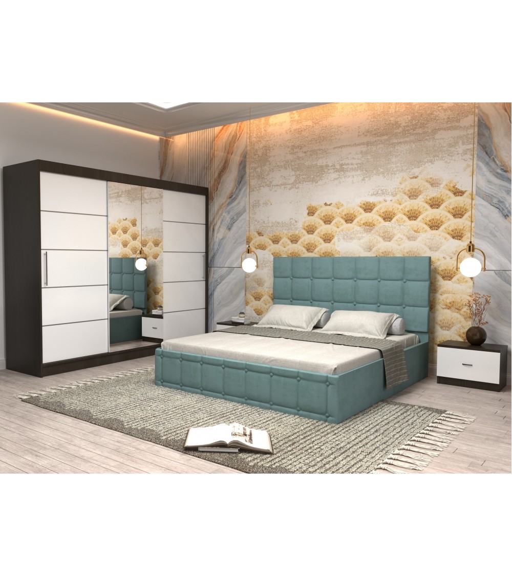 Set Dormitor King Wenge/Turcoaz, 4 Piese, Pat Complet Tapitat Turcoaz 160 X 200, 2Noptiere, Dulap Cu Oglinda 250cm lungime
