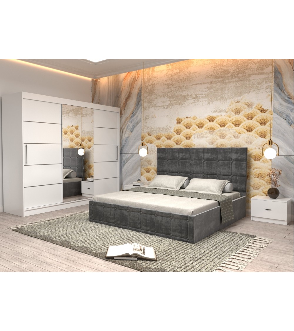 Set Dormitor King Alb/Gri, 4 Piese, Pat Complet Tapitat Gri 160 X 200, 2Noptiere, Dulap Cu Oglinda 250cm lungime