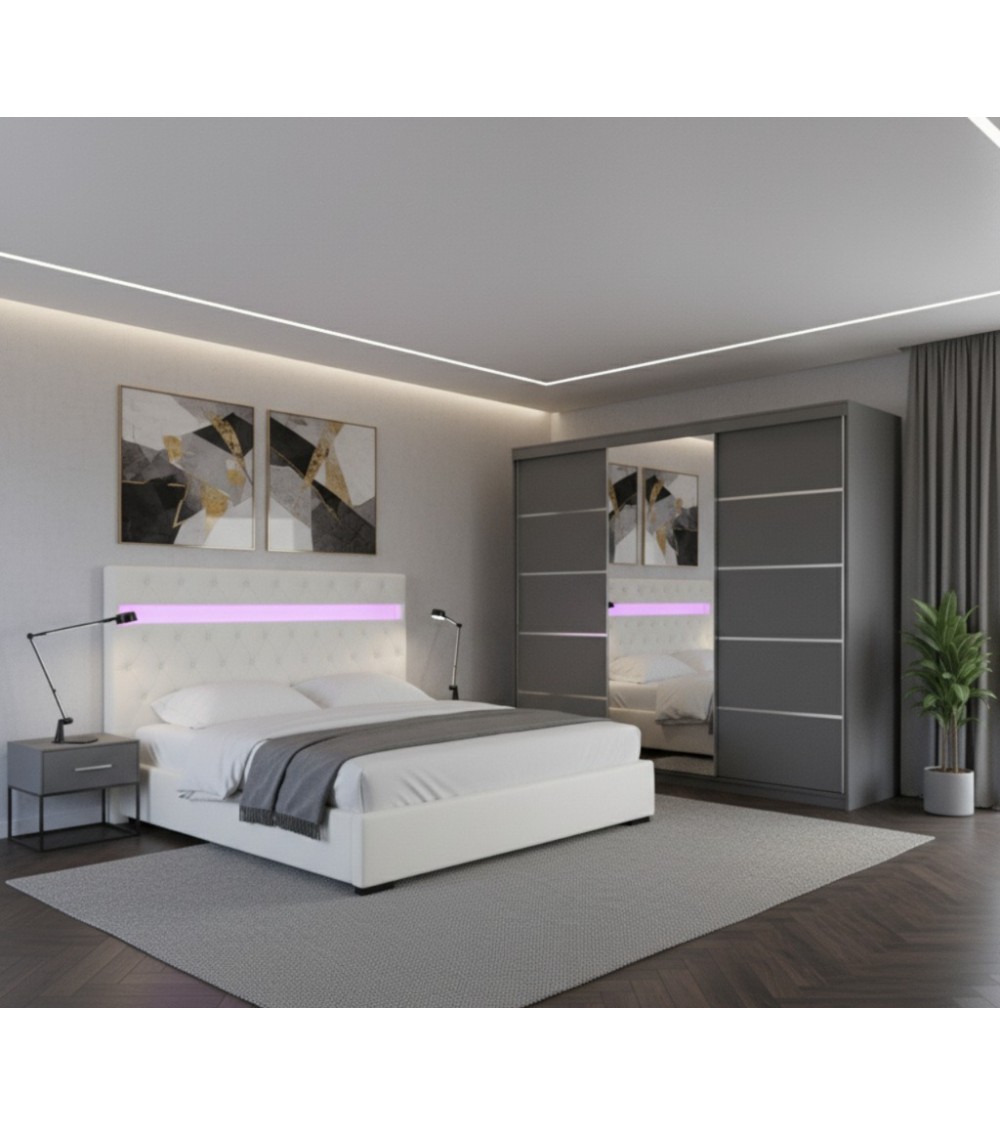 Set Dormitor Porto, pat tapitat Alb cu Led 160x200cm, dulap gri 250cm lungime si saltea 160x200cm inclusa
