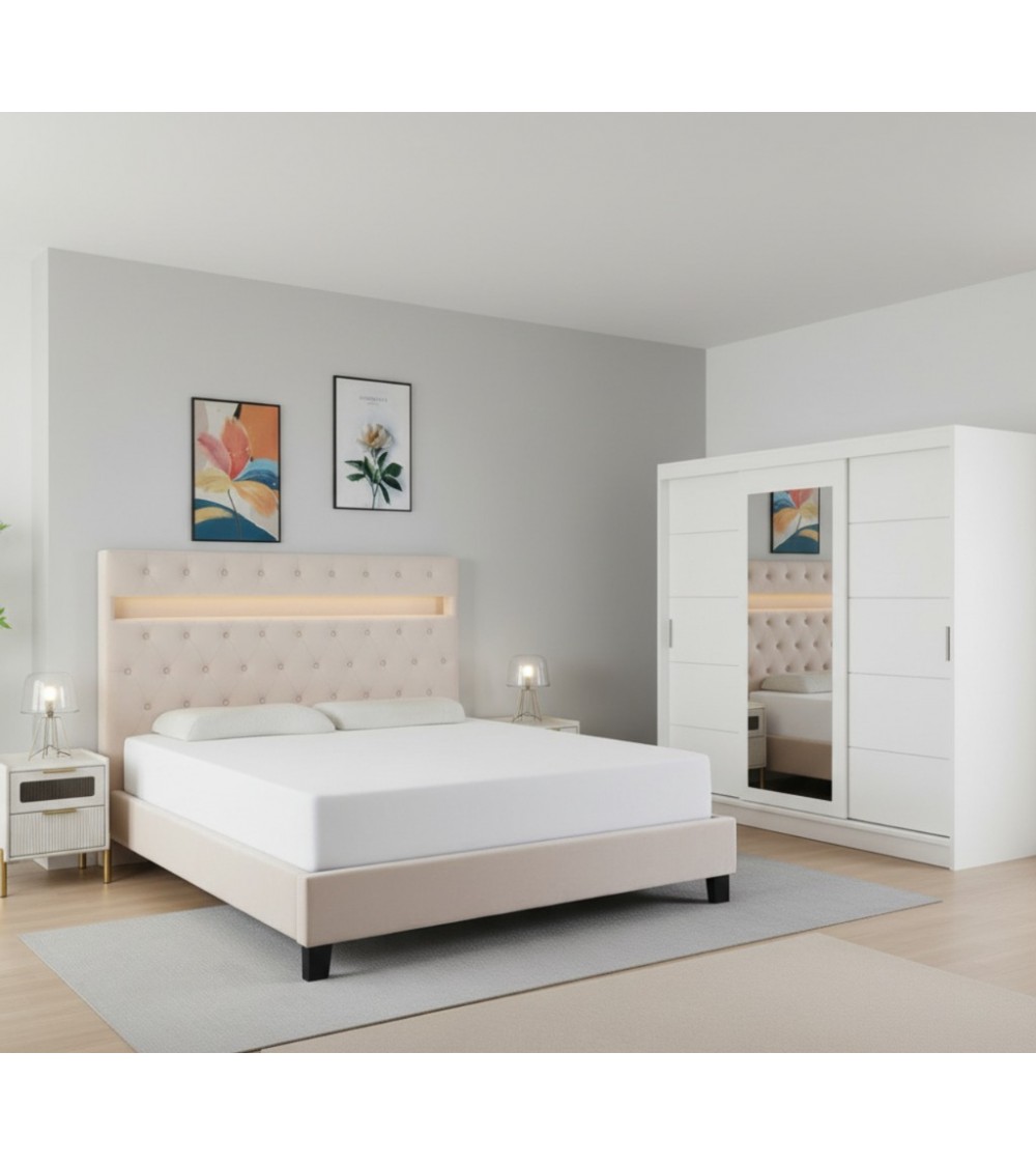 Set Dormitor Porto, pat tapitat Crem cu Led 160x200cm, dulap Alb 250cm lungime si saltea 160x200cm inclusa