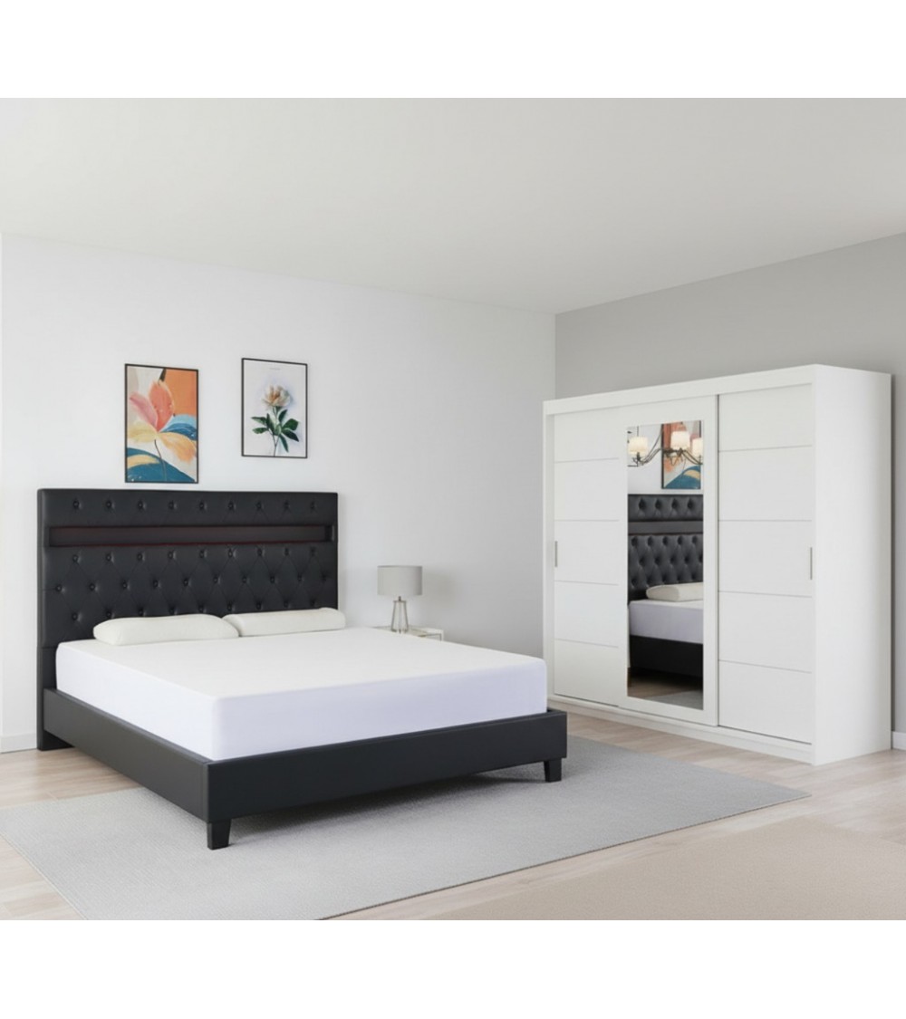 Set Dormitor Porto, pat tapitat Negru cu Led 160x200cm, dulap Alb 250cm lungime si saltea 160x200cm inclusa