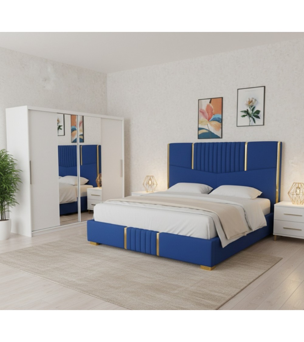 Set Dormitor Benny, pat tapitat Albastru 160x200cm, dulap Alb 200cm lungime si saltea 160x200cm inclusa