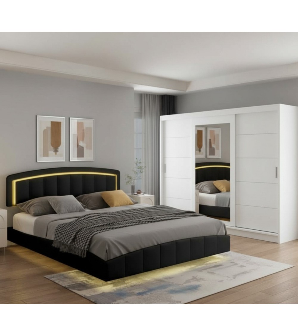 Set Dormitor Andorra, pat tapitat Negru cu Led 160x200cm, dulap Alb 250cm lungime si saltea 160x200cm inclusa