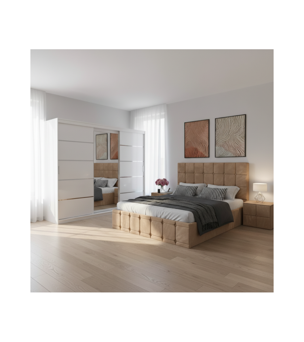Set Dormitor David Alb cu Pat Any03 Crem + Saltea 160x200cm