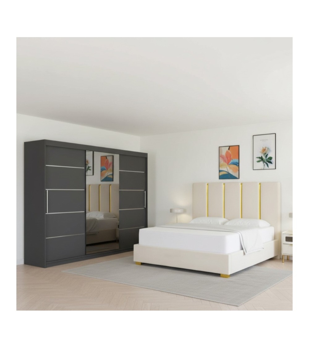 Set Dormitor Patrick, pat tapitat Crem 160x200cm, dulap Gri 250cm lungime si saltea 160x200cm inclusa