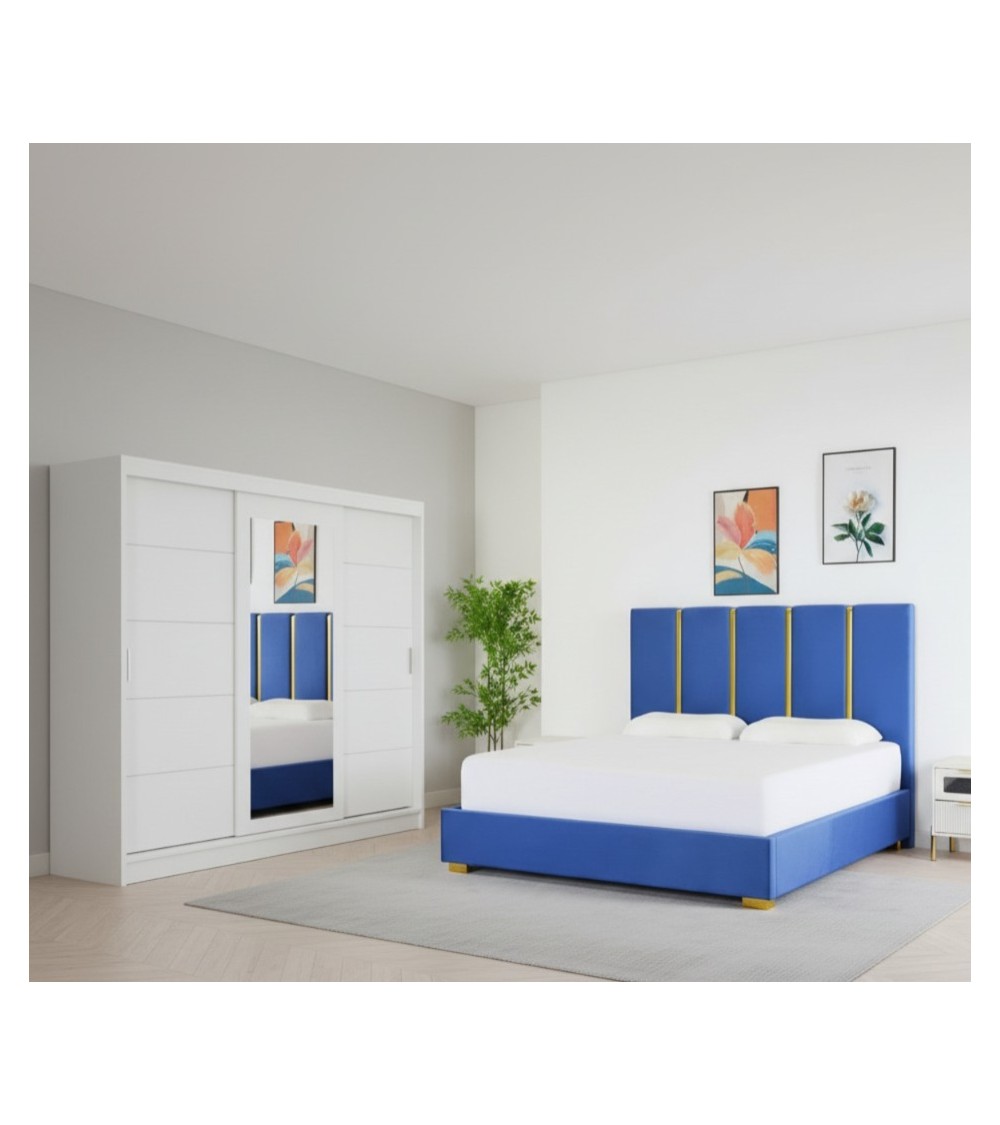 Set Dormitor Patrick, pat tapitat Albastru 160x200cm, dulap Alb 250cm lungime si saltea 160x200cm inclusa
