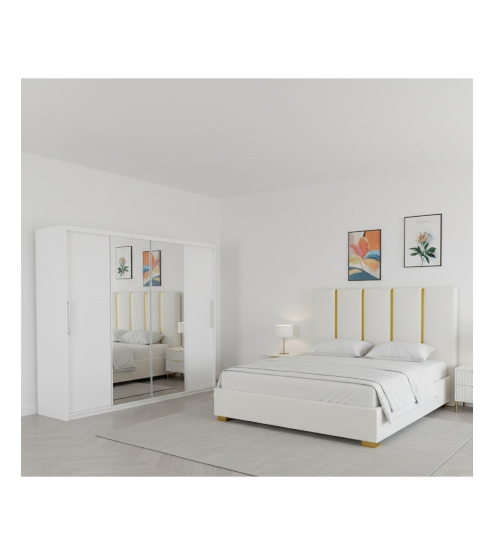 Set Dormitor Patrick, pat tapitat Alb 160x200cm, dulap Alb 200cm lungime si saltea 160x200cm inclusa