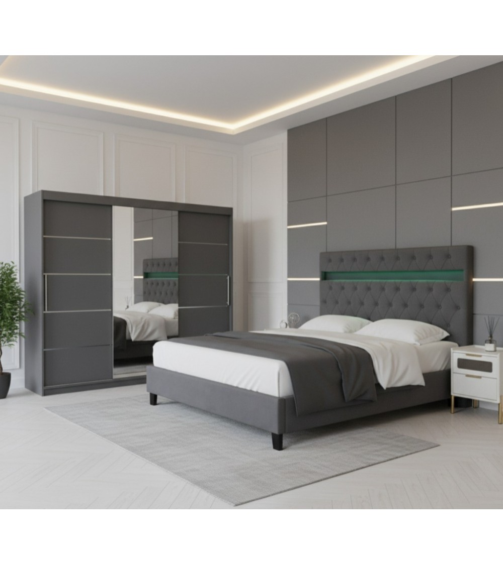 Set Dormitor Porto, pat tapitat Gri cu Led 160x200cm, dulap Gri 250cm lungime si saltea 160x200cm inclusa