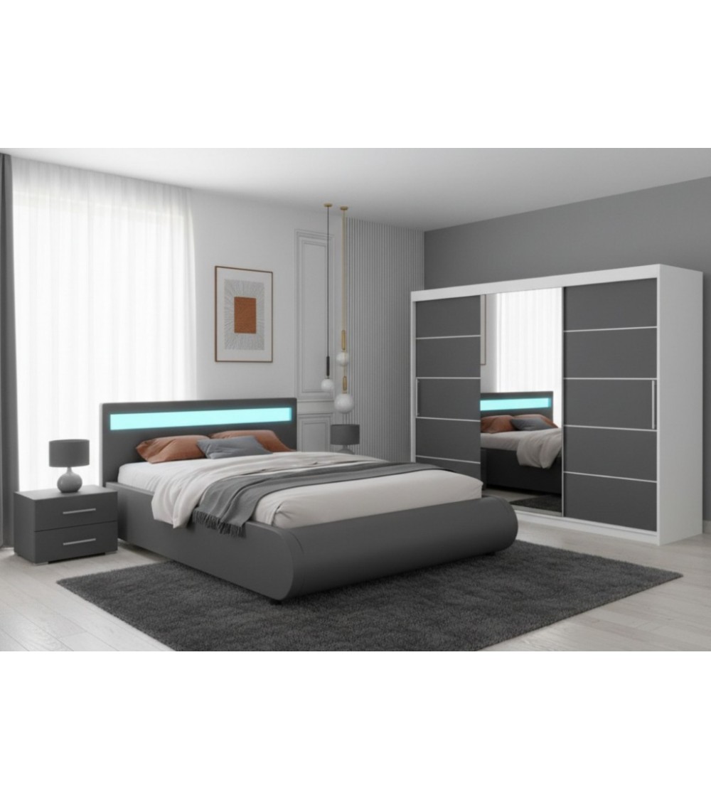 Set Dormitor Berlin, pat tapitat Gri cu Led 160x200cm, dulap Alb/Gri 250cm lungime si saltea 160x200cm inclusa