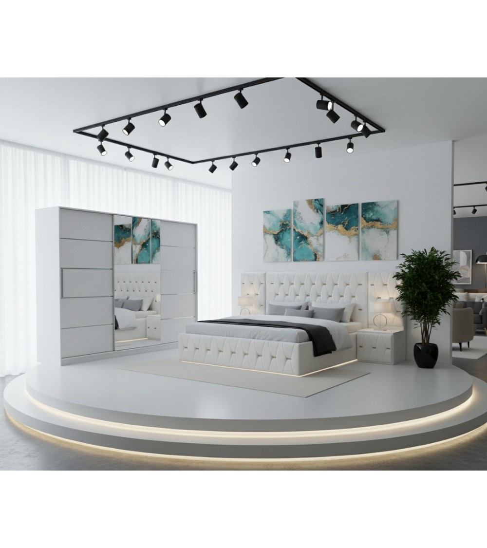 Set Mobila De Dormitor Eric Alb Cu Extensii, pat tapitat 160x200cm, dulap Alb 250cm, 2 noptiere tapitate si saltea 160x200cm