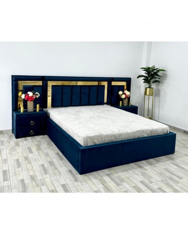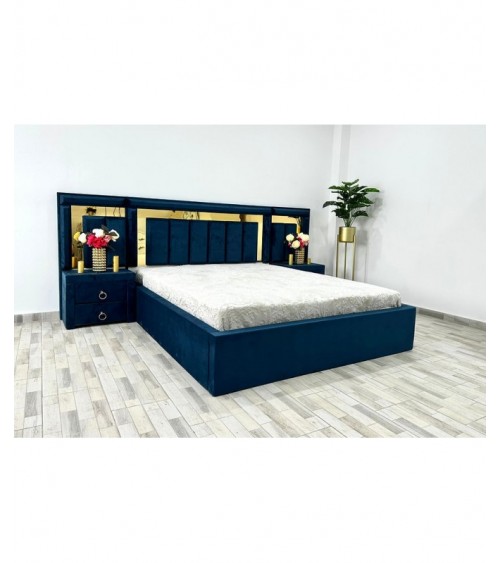 Pat dormitor VEN06, Albastru/Auriu, tapitat, PAL, 2 noptiere, saltea